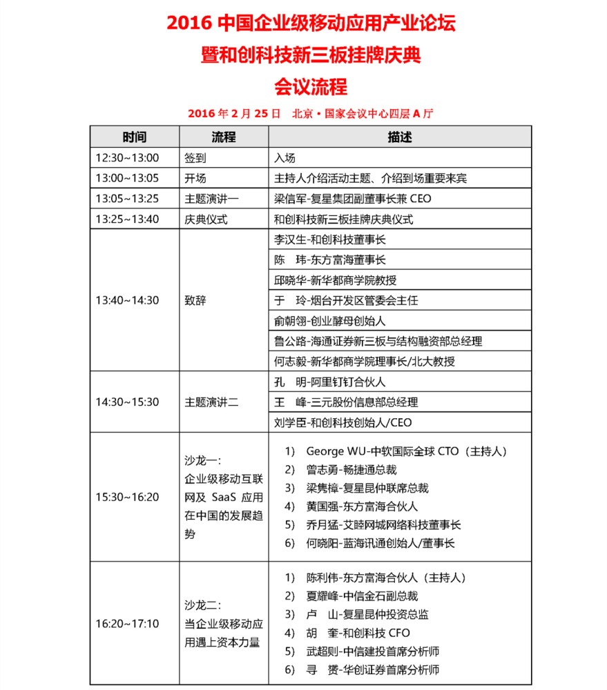 和創科技(證券代碼834218)作為中國企業級移動互聯網SaaS應用第一股,是在和創科技各位股東、客戶、合作伙伴及團隊的長期支持和卓越努力下,服務了國內近十萬家企業。作為產業級SaaS移動應用的領軍企業,和創科技將聯合復星昆仲、東方富海、新華都商學院于2016年2月25日下午在北京國家會議中心共同舉辦“2016中國企業級移動應用產業論壇暨和創科技新三板掛牌慶典”,這即是答謝各位股東朋友們的長期支持,也是剖析產業級SaaS行業在產品研發、市場營銷、運維續費和資本進入等方面的行業主題。