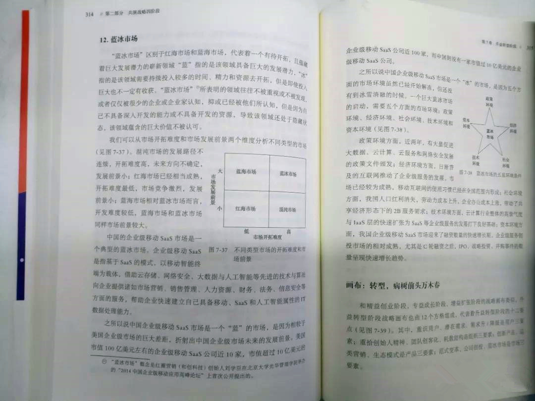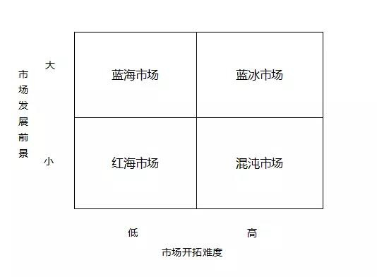 我們可以從市場開拓難度和市場發展前景兩個維度分析不同類型的市場?;煦缡袌龅陌l展路徑不連續,開拓難度高,未來方向不確定,發展前景小;紅海市場已經相當成熟,開拓難度最低,市場競爭激烈,發展前景??;藍海市場相對藍冰市場而言,開發難度較低,藍海市場和藍冰市場同樣市場前景較大。