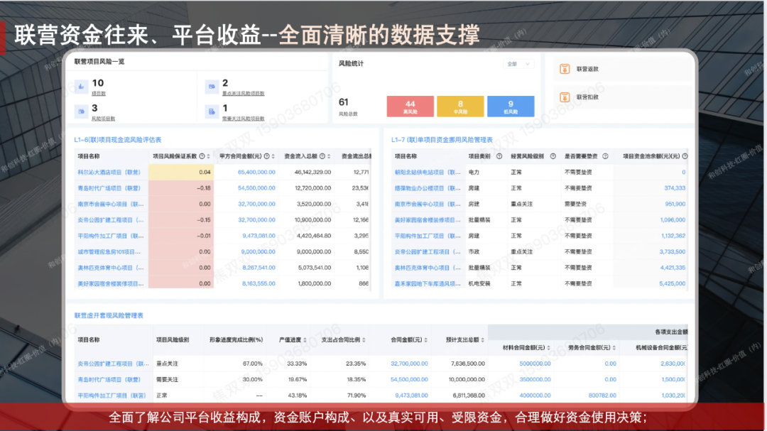 當前公司數字化程度較低,通過簡單的oa軟件、Excel表格、微信群、例會等傳統的管理方式進行管理。近幾年隨著公司省外業務的拓展,項目越來越大,傳統的低效管理模式已經無法滿足日常的管理需求。公司聯營項目較多,個別項目出現資金挪用,虛開套現,造成不必要的法律訴訟官司,甚至資金賬戶被凍結。此外,公司自營項目,人材機等各項成本,當前人工進行把控,項目利潤不達預期;人工進行統計,需要扒賬,實效性差,財務報表不能實時動態呈現。