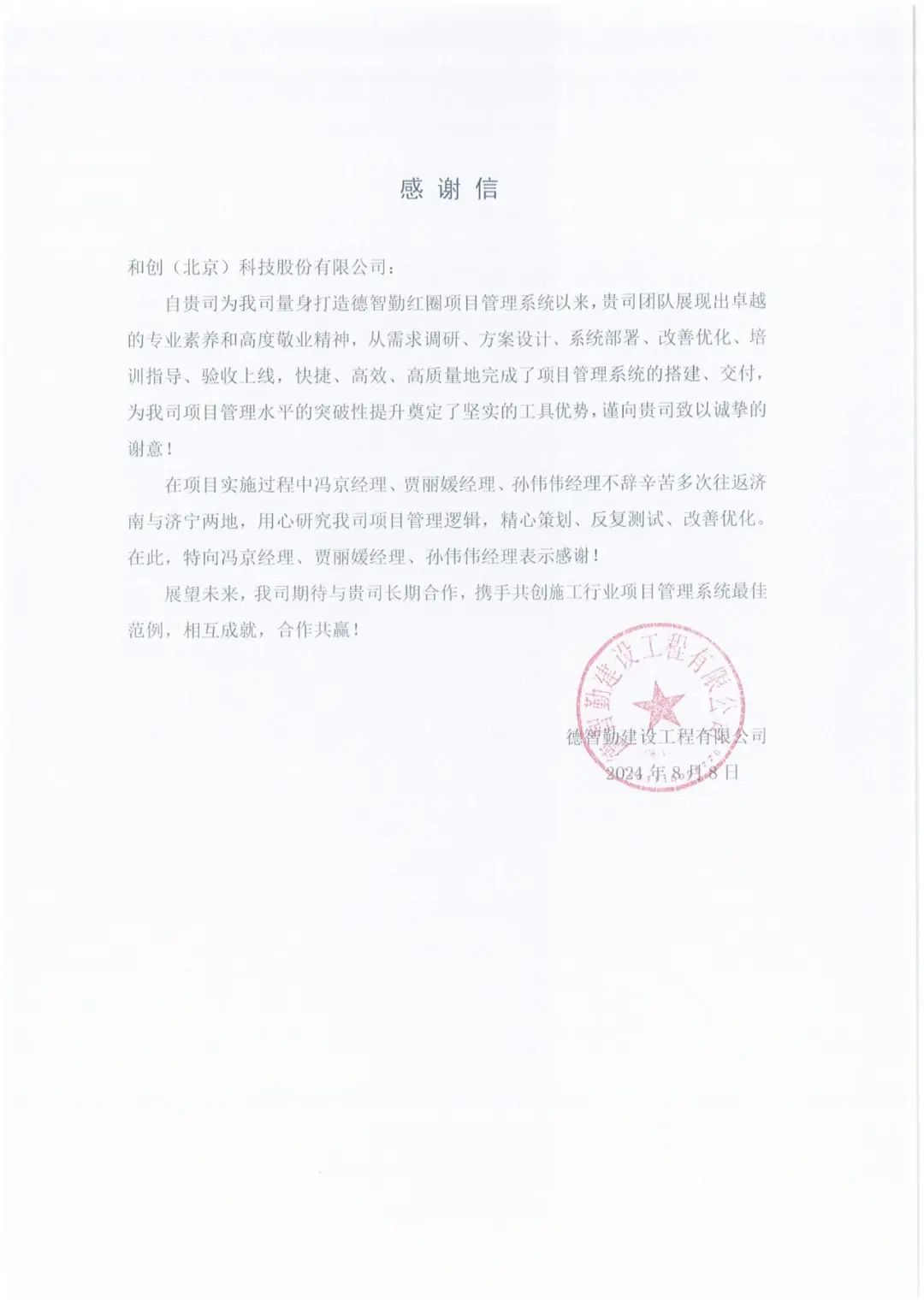 合作企業?|?德智勤建設工程有限公司向紅圈發來感謝信!