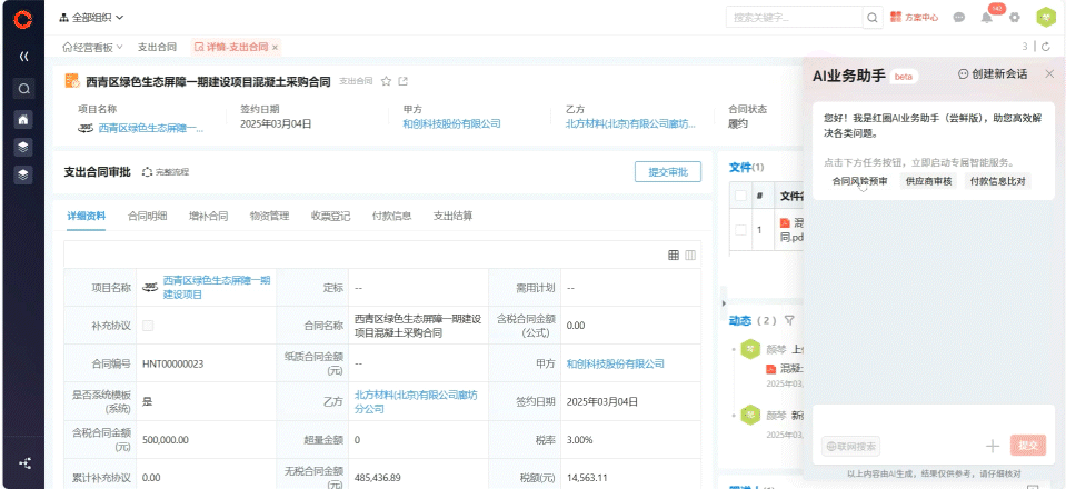 憑借大模型強大的通用智能和推理能力,紅圈AI業務助手能夠幫助客戶在供應商審核、合同風險評估、付款管控等諸多領域和場景中持續改善業務流程,強化分析決策能力,提升用戶使用體驗。