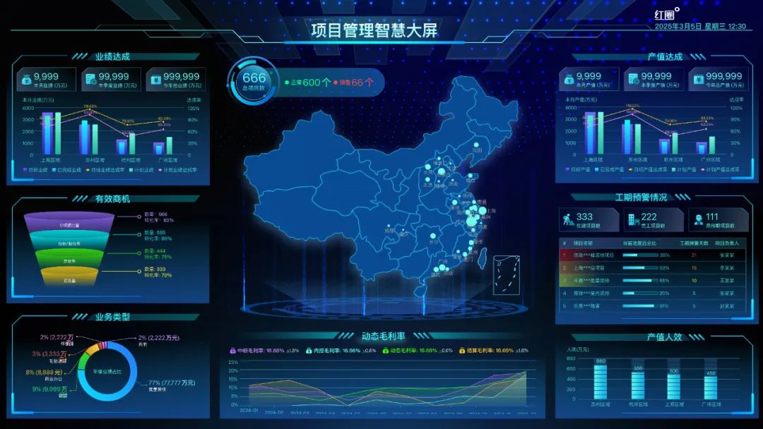 其中,紅圈即將上線的工程智慧大屏,可以集成多個業務版塊的數據,如成本、進度、資金、合同、質安等,提供直觀、全面的數據展示,讓管理者免去手機操作、輕松獲取項目一攬信息,從而做出有效決策。