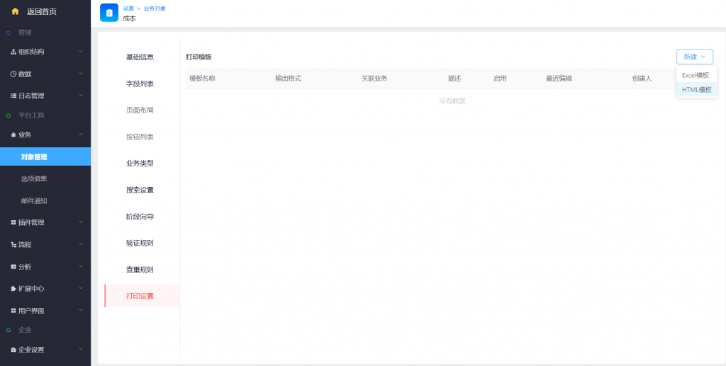 - 配置和普通excel模板打印設置在一起,路徑為:系統(tǒng)設置——業(yè)務——對象管理——打印設置。