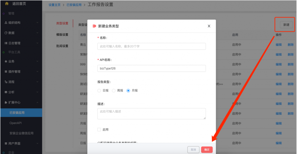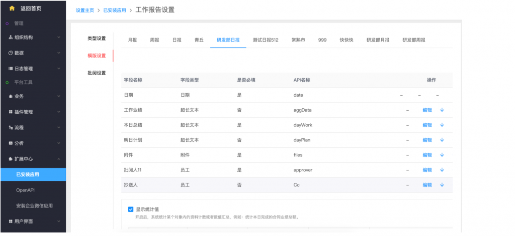 - 后臺設置:系統(tǒng)設置——擴展中心——已安裝應用——工作報告,類型設置支持新建類型;在模板設置中,可以按業(yè)務類型設置不同的字段和統(tǒng)計值;統(tǒng)計值設置,支持自定義名稱;