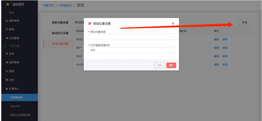 - 系統(tǒng)設置——擴展中心——已安裝應用——活動,增加了“拜訪位置設置”。新建拜訪位置設置,選擇拜訪對象、設置參考字段并設置允許偏差范圍