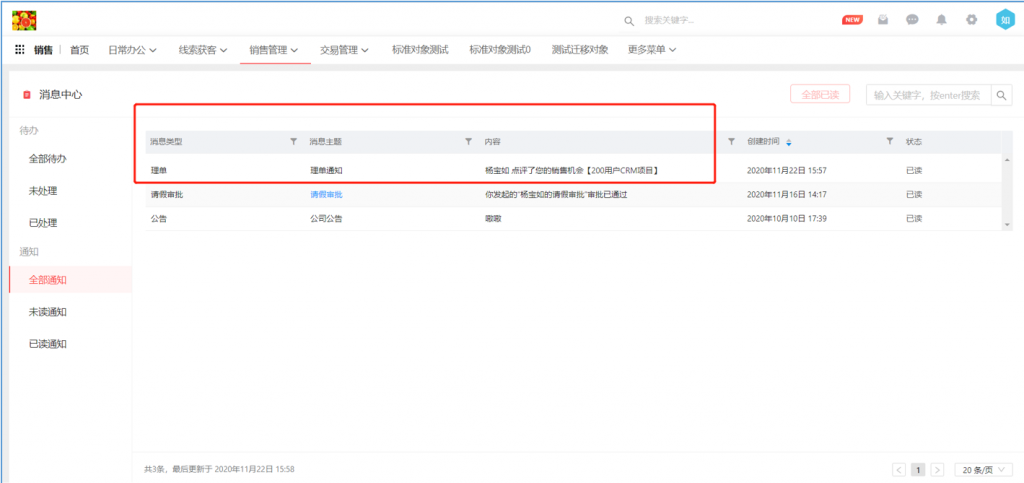 理單后,系統默認給機會負責人發內部消息通知