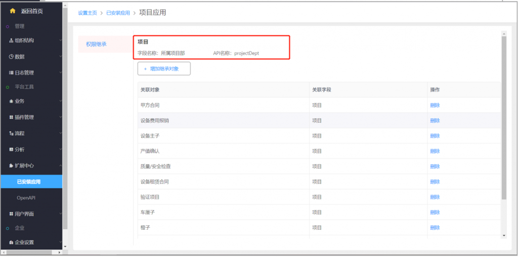 1)開通項目多維度后,在后臺已安裝應(yīng)用中,可以看到“項目應(yīng)用”;打開后可以看到項目上已經(jīng)增加的部門字段名稱和API