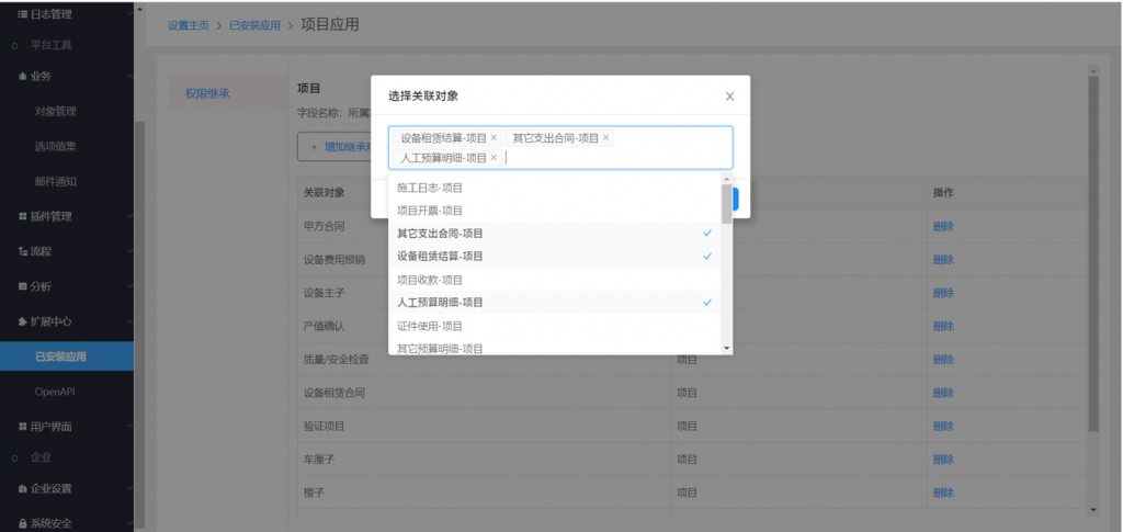 2)添加與項目關(guān)聯(lián)的業(yè)務(wù)對象,如合同、收付款、開票、設(shè)備和工程量清單等;