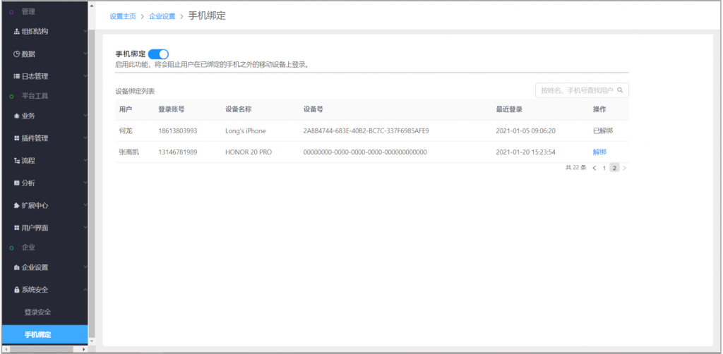 開啟后,用戶在手機(jī)端登錄綁定后,會生成一條綁定數(shù)據(jù)