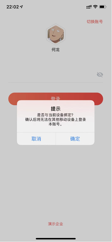 功能開啟后,賬號第一次在移動端登錄時,將提示進(jìn)行設(shè)備綁定,同意后可正常進(jìn)入系統(tǒng)使用;取消則無法登錄,如果需要更換手機(jī),請聯(lián)系管理員進(jìn)行后臺的解綁操作