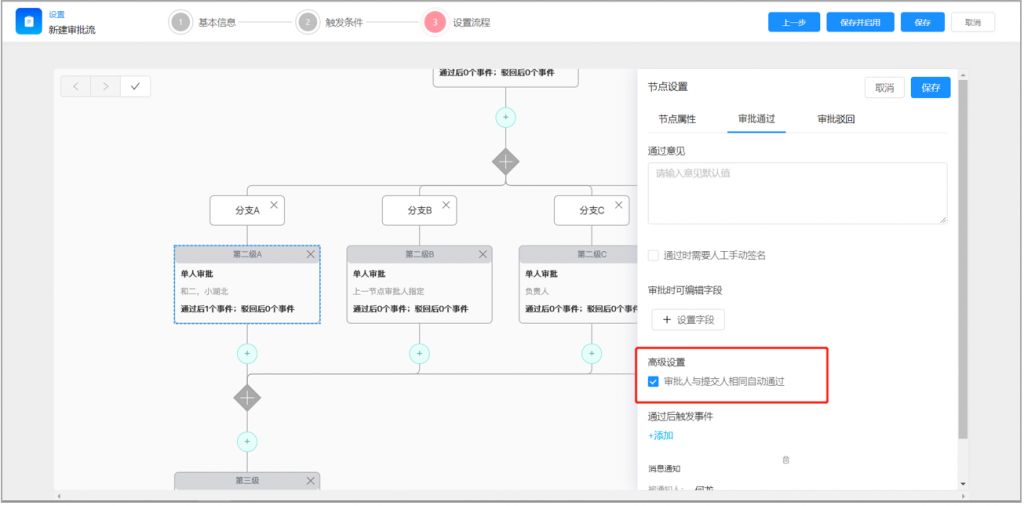 2)審批流節(jié)點(diǎn),可配置當(dāng)與提交人相同時,自動通過,減少重復(fù)操作