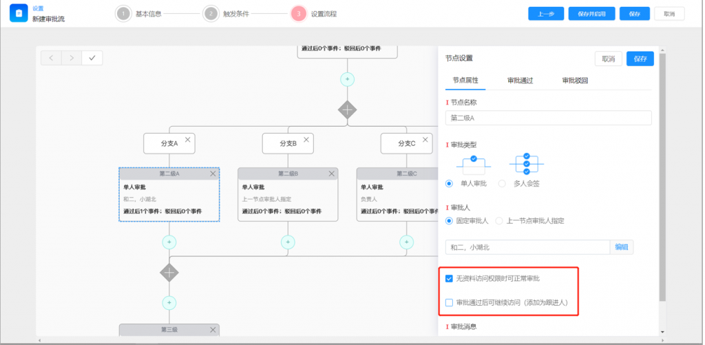 3)當(dāng)節(jié)點(diǎn)審批人沒有數(shù)據(jù)權(quán)限時,可以通過配置實(shí)現(xiàn)臨時授權(quán),還能再審批后添加為跟進(jìn)人,在保持?jǐn)?shù)據(jù)權(quán)限的不擴(kuò)散的前提下,保障特殊審批節(jié)點(diǎn)的順利推進(jìn)