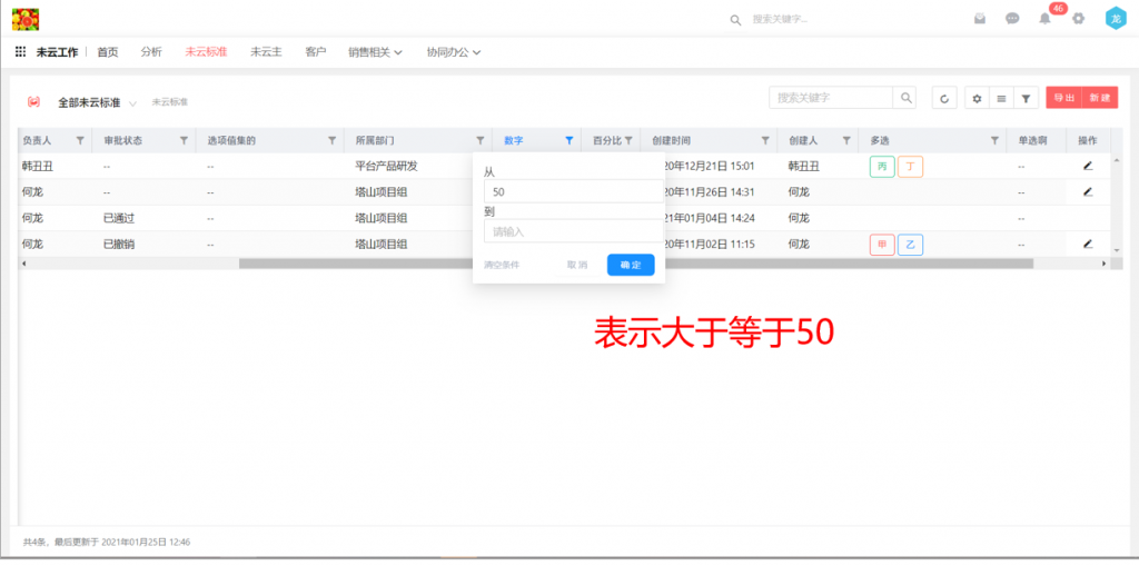 7)數(shù)據(jù)列表中,數(shù)值型字段在表頭篩選時可以只輸入一邊,或者兩邊輸入相同數(shù)值,進(jìn)行篩選