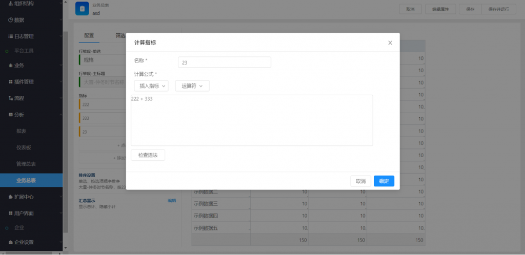 1) 與管理總表類似,業(yè)務(wù)總表中增加了計算指標(biāo),支持指標(biāo)列之間進(jìn)行簡單四則運(yùn)算,滿足更多的分析場景
