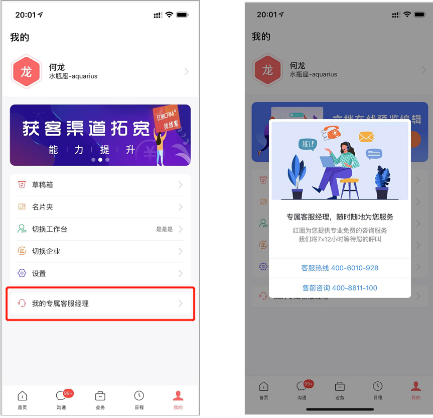 3)移動端在“我的”中,增加專屬客服經(jīng)理的電話展示