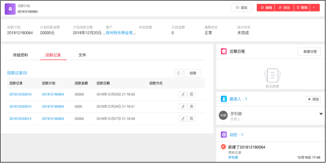 紅圈CRM+能夠幫助企業建立清晰的項目回款計劃,在對施工進度進行管理的同時,同步推進回款管理,企業可以清楚地掌握各個項目的回款情況,系統還能對逾期回款計劃進行提醒(提醒規則可以按企業實際需求設定),幫助企業加速資金回籠。