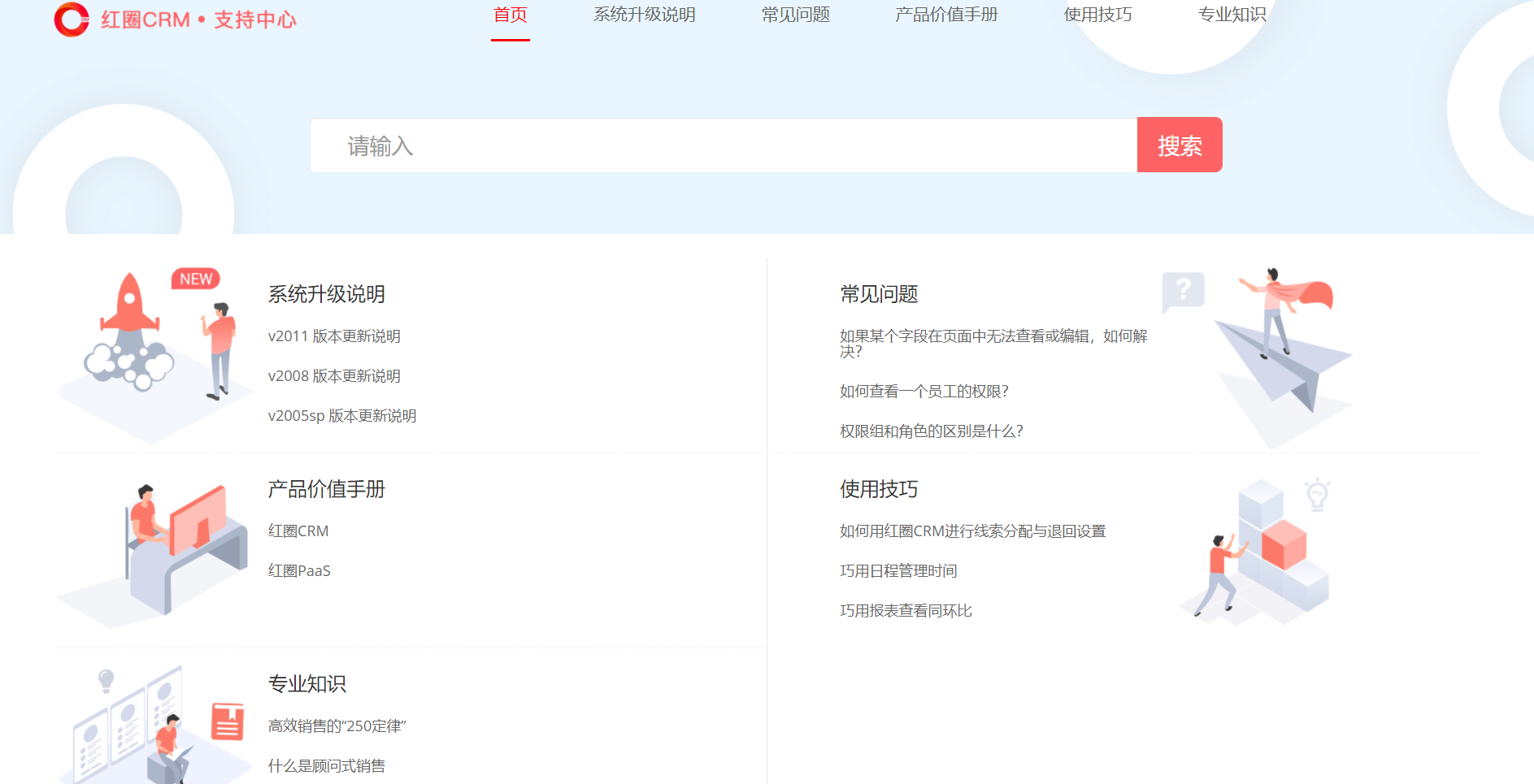 新版本增加了支持中心,包含版本更新說明、產品價值手冊、常見問題、使用技巧、專業知識。支持中心可以幫助用戶在使用紅圈 CRM 的時候對它有更深入的了解。如果用戶對產品有任何建議和意見,也可以通過意見反饋提交給我們。