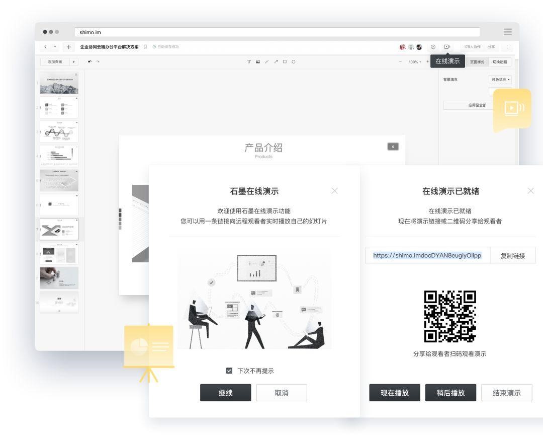 石墨還提供支持多人協(xié)作的幻燈片,團(tuán)隊(duì)成員可通過二維碼、鏈接分享給觀眾,無論身在何方,演示時(shí)觀眾只需打開電腦、手機(jī)、Pad 等設(shè)備就能實(shí)時(shí)同步播放,即使遠(yuǎn)隔萬里也如同在一個(gè)會(huì)議室面對(duì)面交流。