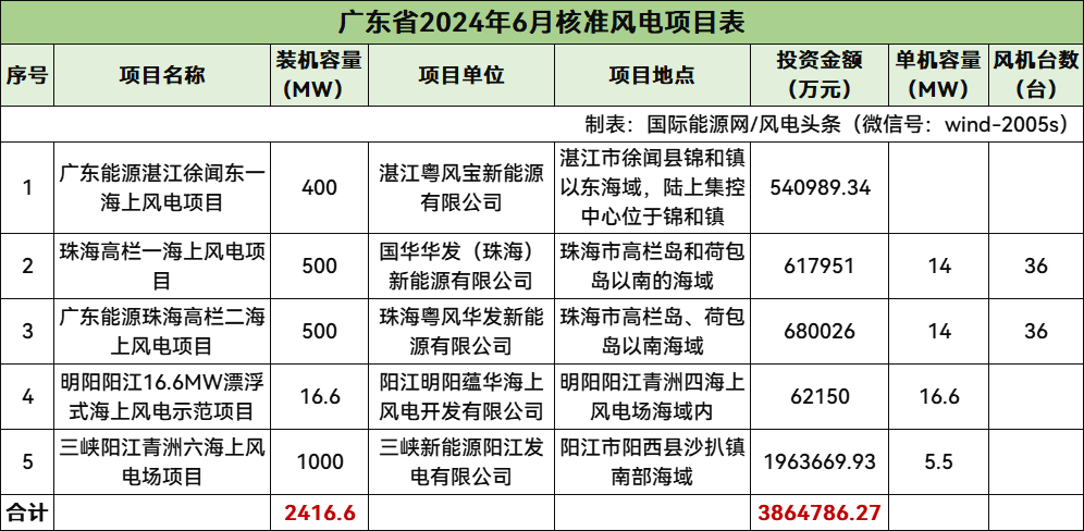 廣東核準5個風電項目,總規模2416.6MW,總投資3864786.27萬元,均為海上風電項目。