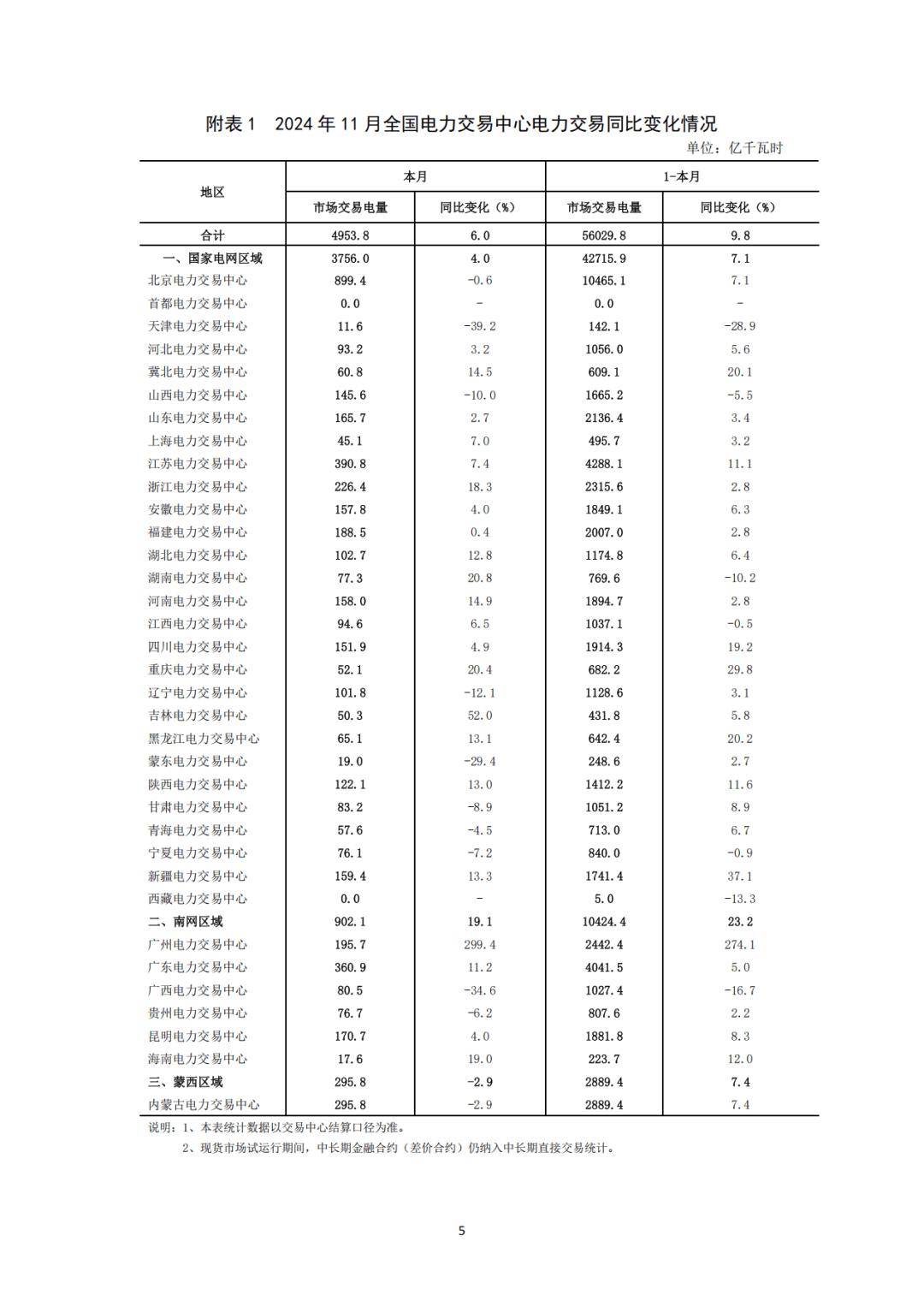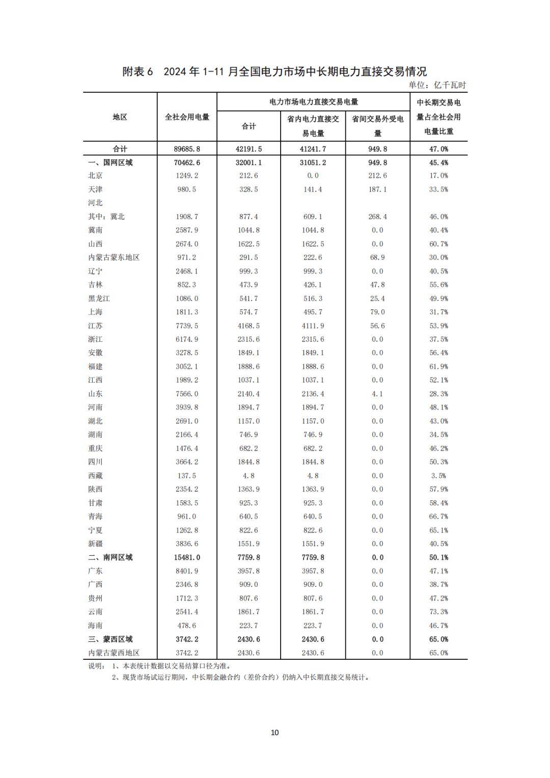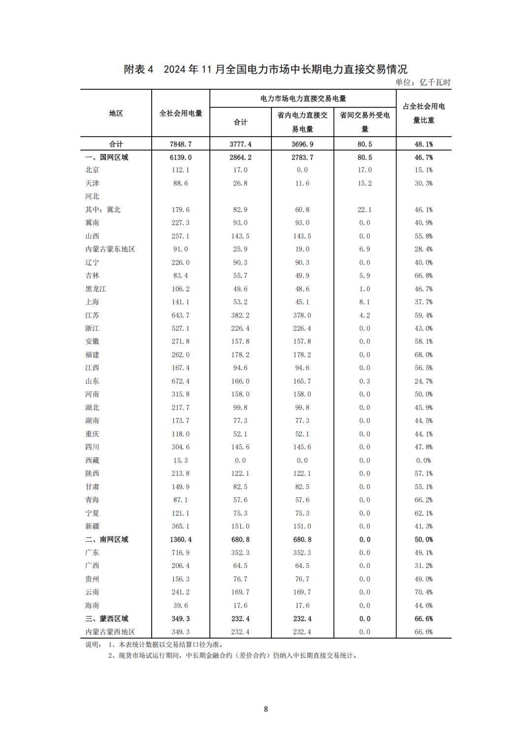 分區(qū)域看,1-11月,國(guó)家電網(wǎng)區(qū)域中長(zhǎng)期電力直接交易電量合計(jì)為32001.1億千瓦時(shí),同比增長(zhǎng)5.4%;南方電網(wǎng)區(qū)域中長(zhǎng)期電力直接交易電量合計(jì)為7759.8億千瓦時(shí),同比增長(zhǎng)5.2%;蒙西電網(wǎng)區(qū)域中長(zhǎng)期電力直接交易電量合計(jì)為2430.6億千瓦時(shí),同比增長(zhǎng)11.1%。