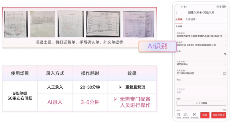單據(jù)錄入是工程成本管控的“隱形人力黑洞”。AI錄單助手作為“智能掃描儀”,通過大模型自動識別合同、結(jié)算單、出入庫單等單據(jù)關(guān)鍵字段(如金額、工期、付款節(jié)點(diǎn)),實(shí)現(xiàn)圖像識別到系統(tǒng)錄入的秒級閉環(huán)。傳統(tǒng)流程中,成本專員需手動提取合同條款,材料員需逐條登記數(shù)千種物料信息,人力投入大且易出錯。該模塊減少90%人工操作,使成本數(shù)據(jù)歸集效率提升2.5倍,讓執(zhí)行層從重復(fù)勞動轉(zhuǎn)向高價(jià)值管控。