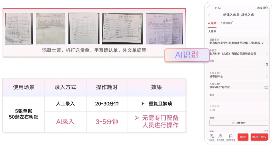 大量手寫確認單、混凝土票據、支出合同、機打送貨單和辦公登記表的錄入任務,不管是在出差途中或辦公場景中,員工只需將紙質單據拍照上傳,即可實現一鍵識別與系統自動錄入,徹底擺脫繁瑣工作、減少重復勞動。