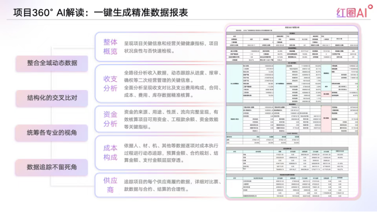 比如項目360°AI解讀,你想了解某個項目的情況,不用再讓下屬寫報告——點一下按鈕,系統自動生成一份“效益體檢報告”:資金夠不夠用?成本有沒有超支?進度是不是滯后?甚至能告訴你“成本超支是因為某分包商頻繁變更合同”,連優化建議都給出來。相當于給你配了個“智能參謀”,不用自己扒數據,問題根因、解決方向全清楚。
