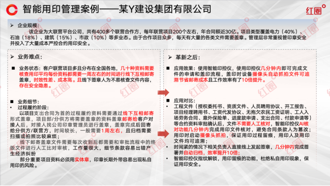 紅圈智能印控一體化解決方案的應用,成功幫助企業實現了從依賴“人防”到依托“技防”的本質跨越,帶來了效率與安全的雙重提升。