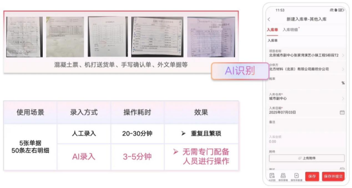 數(shù)據(jù)的源頭是業(yè)務(wù)單據(jù),錄入的繁瑣與錯(cuò)誤是成本失控的隱患之一。紅圈AI系列智能產(chǎn)品中的AI錄單助手作為企業(yè)的“智能掃描儀”,能通過(guò)大模型自動(dòng)識(shí)別混凝土票、送貨單、手寫(xiě)確認(rèn)單乃至合同等各類單據(jù),實(shí)現(xiàn)從圖像識(shí)別到高質(zhì)量系統(tǒng)錄入的秒級(jí)閉環(huán),可減少90%人工操作。它不僅能提取關(guān)鍵字段,更能智能匹配合同明細(xì)、關(guān)聯(lián)歷史數(shù)據(jù),讓成本歸集更智能、溯源更方便,從而迭代了整個(gè)成本管控流程。