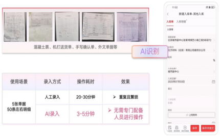 在工地,比扛鋼筋更累的是錄單據(jù)——合同、結(jié)算單、出入庫單,年輕技術(shù)員每天花幾小時對著紙質(zhì)單據(jù)敲鍵盤,枯燥易錯,毫無成就感。紅圈AI深刻理解這些場景:成本專員需手動處理合同文本,逐頁閱讀并提取關(guān)鍵信息;施工班組每月提交的紙質(zhì)結(jié)算單需逐條輸入系統(tǒng);單項目材料種類可達(dá)數(shù)千種,材料員需每天及時逐條輸入出入庫信息。