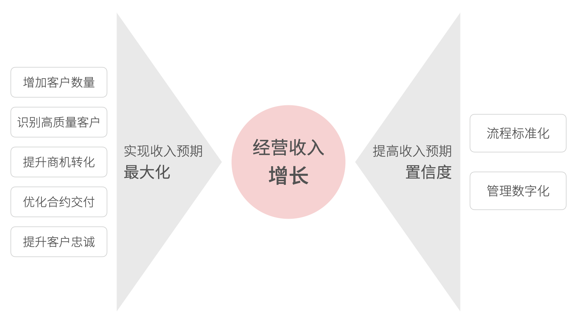 為了實現(xiàn)企業(yè)經(jīng)營收入增長這個核心目標(biāo),CRM 軟件需要企業(yè)實現(xiàn)收入預(yù)期最大化和提高收入預(yù)期置信度。實現(xiàn)收入預(yù)期最大化這個目標(biāo)可以從五個方面入手:增加客戶數(shù)量、識別高質(zhì)量客戶、提升商機(jī)轉(zhuǎn)化、優(yōu)化合約交付、提升客戶忠誠。而提高收入預(yù)期置信度的本質(zhì)是降低業(yè)務(wù)戰(zhàn)略執(zhí)行的不確定因素,從人治模式轉(zhuǎn)型為系統(tǒng)管理,即流程標(biāo)準(zhǔn)化和管理數(shù)字化。