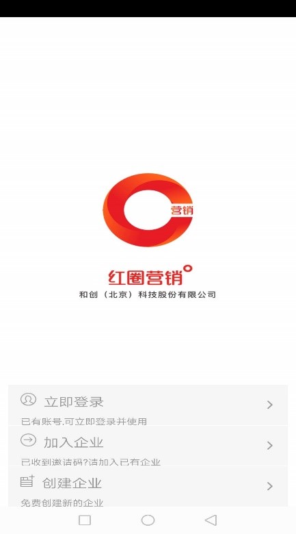安裝完畢打開APP,可以看到三種登錄方式:立即登錄、加入企業(yè)、創(chuàng)建企業(yè);